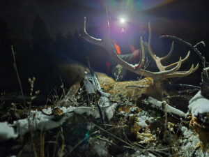 A few cows fed out of the timber, so we hustled their direction. They ended up slipping away, but we continued on in hopes a bull would follow. With about 30 minutes left of legal shooting light, I threw my binos up on a timbered hillside and glassed a lone 6×6 feeding. He was in range, and Andrew made a clean shot and harvested his best bull to date. But the fun wasn’t over.